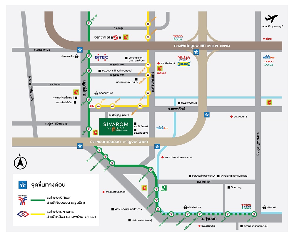 เดินทางสะดวกสบาย ใกล้ถนนสุขุมวิท, ถนนเทพารักษ์, ถนนศรีนครินทร์, วงแหวนตะวันออก-กาญจนาภิเษก ใกล้รถไฟฟ้า 2 สาย ทั้งรถไฟฟ้าสายสีเหลือง สถานีทิพวัล และ รถไฟฟ้าสายสีเขียว สถานีช้างเอราวัณ
